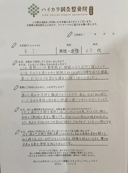 または、どんなことで悩んでおられましたか? - 家の近所、肩こり、腰痛で来院。